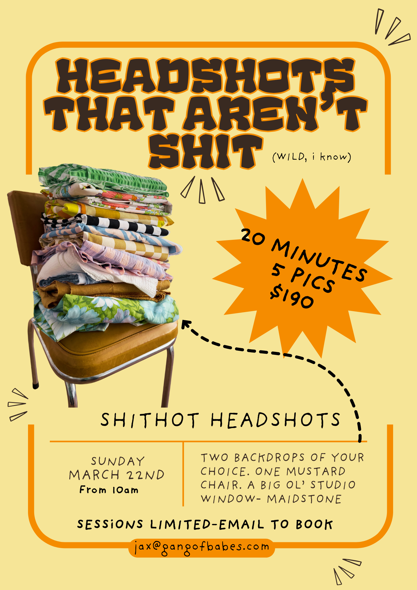 You may be totally happy with my go-to solution, where you come to my light filled space and we shoot you in-front of a few of my backdrops, It may be 10 minutes in front of a fun wall, a few hours of us being creative in the city or a field of flowers, or an hour photographing your whole team in your workplace, whatever your vibe-there is a shit hot head shot package for you!